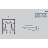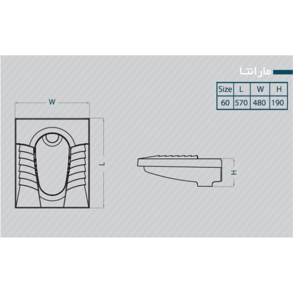 ابعاد این توالت زمینی ۱۹*۴۸*۵۷ سانتی متر و سایز آن ۶۰ است. توالت ها عمدتا در دو نوع آبریز باز و آبریز بسته هستند. این توالت ایرانی همان طور که گفته شد از نوع ریم بسته می باشد. در این توالت ها به وسیله کانال بسته اطراف کاسه و سوراخ هایی که در دو طرف قرار دارند ، آب در هنگام استفاده از فلاش تانک با شدت بیشتری وارد کاسه می گردد و عملیات شست و شو و آب گیری به نحو کامل تری صورت می پذیرد. این توالت ایرانی در سه درجه برای مشتریان تولید و عرضه می گردد.